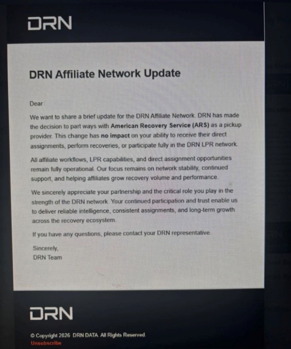 Last week, Digital Recognition Network (DRN) released a memo to its agent network that caught many off guard. In that memo, the stated that they were parting ways with their relationship with American Recovery Service (ARS) as a “pickup provider”. Why; is the question many are asking.