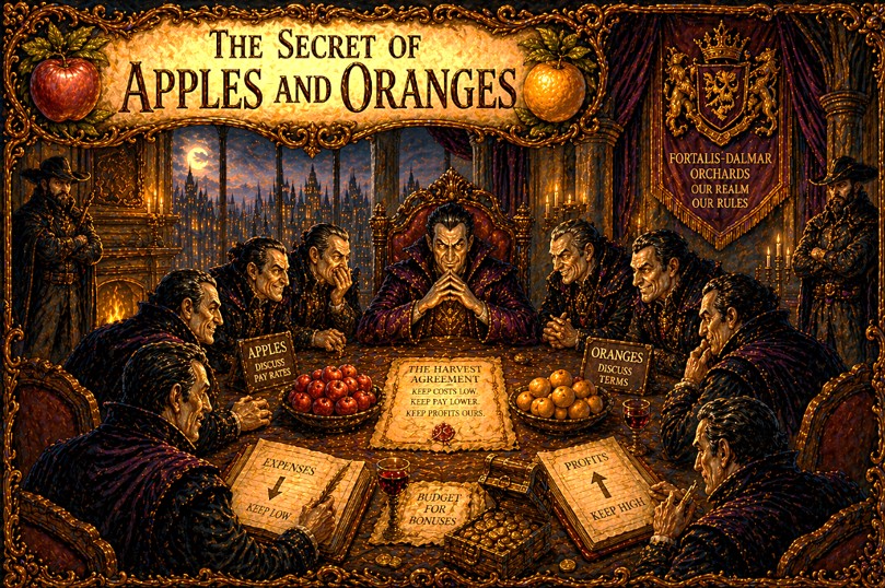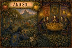 Once upon a time, long ago, in a vast and sunlit land far-far away known as Fortalis-Dalmar, there stretched the greatest orchards ever grown. Their trees ran beyond the horizon; apples glowing like embers and oranges shining like captured suns. Travelers whispered that all the fruit in the kingdom flowed from this one mighty place, and that its influence reached far beyond its borders.