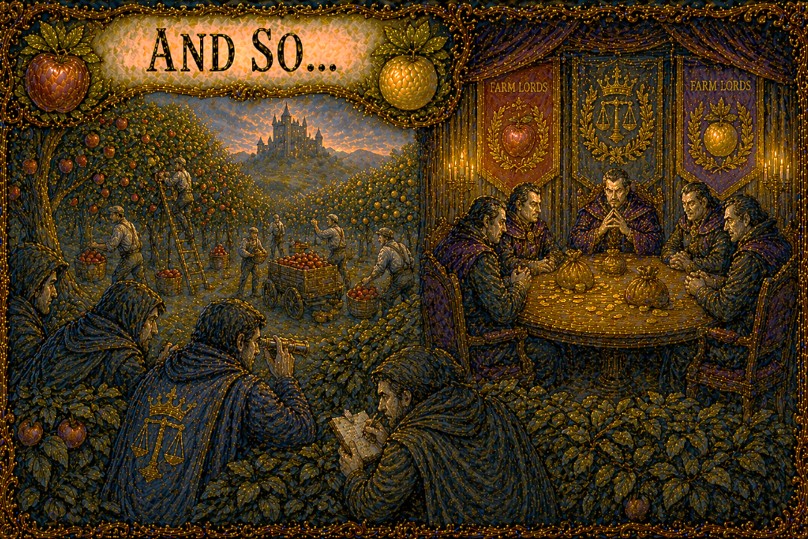 These orchards belonged to powerful Farm Lords; towering figures draped in fine cloth, masters of enormous estates. Their storehouses overflowed with fruit and gold alike. They dined together, traded favors, and spoke as if the land itself answered to them.