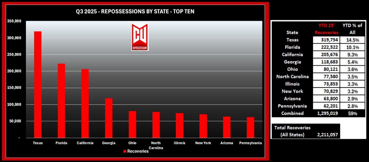 Combined, these ten states accounted for 1,295,019 repossessions. As previously stated, this accounts for 59% of the total 2,211,057 repossessions conducted through the RDN portal as of the end of Q3 2025.