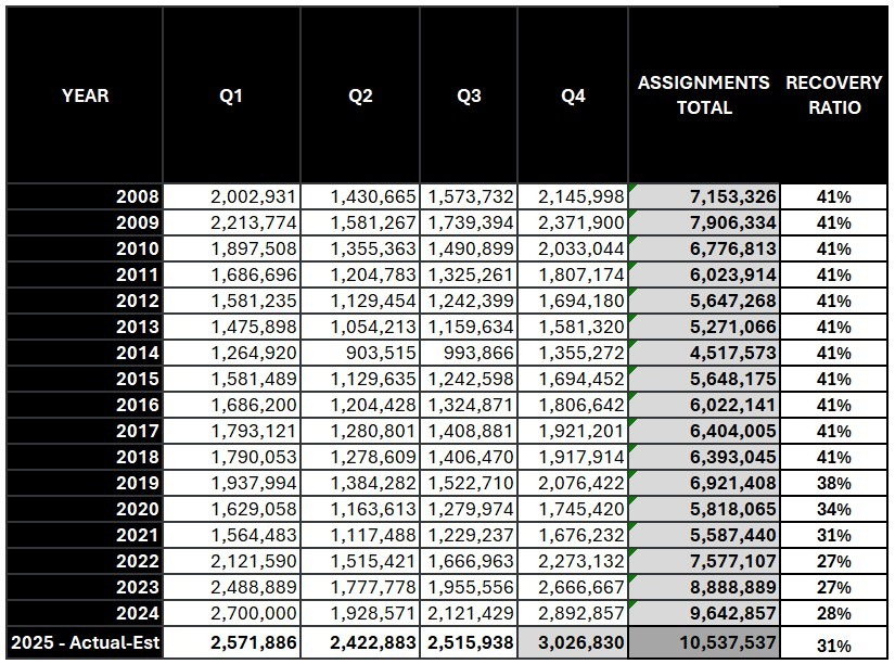 With 769,295 repossessions in Q3 alone, the data shows that there have been 2,211,057 repossessions recorded by RDN year to date (YTD). With the 4th quarter traditionally displaying the highest spikes in delinquency, the repossession volume tends to follow along and even if the volume is the same as in 2024, it will exceed 3M by the end of the year.